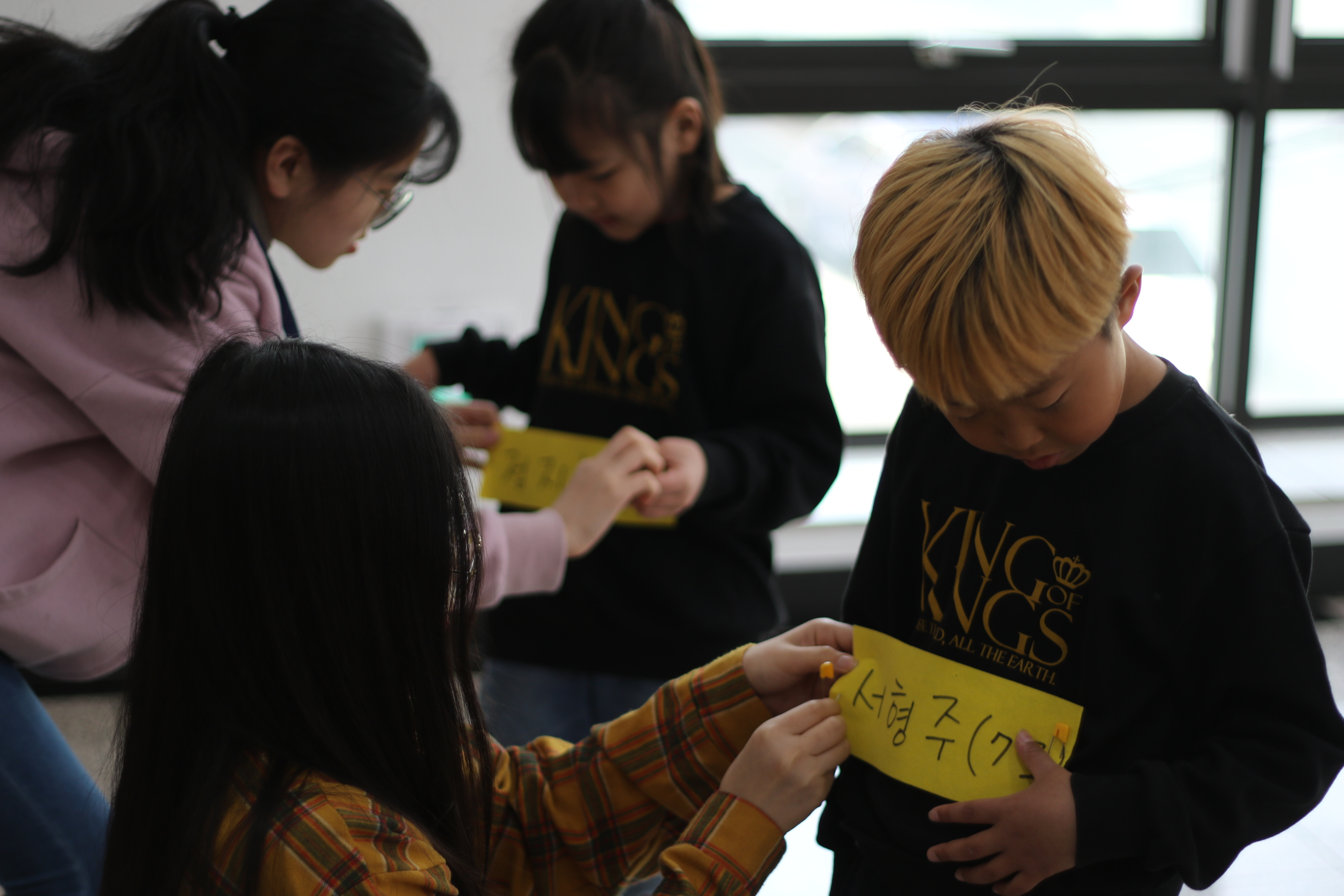 초등부 친구들의 이름표를 붙이고 있어요. 엘로아찬양팀 친구들은 찬양준비로 1시간 빨리 오전9시까지 교회에 도착했어요. 형주와 지슬이가 이름을 붙이고 있네요.