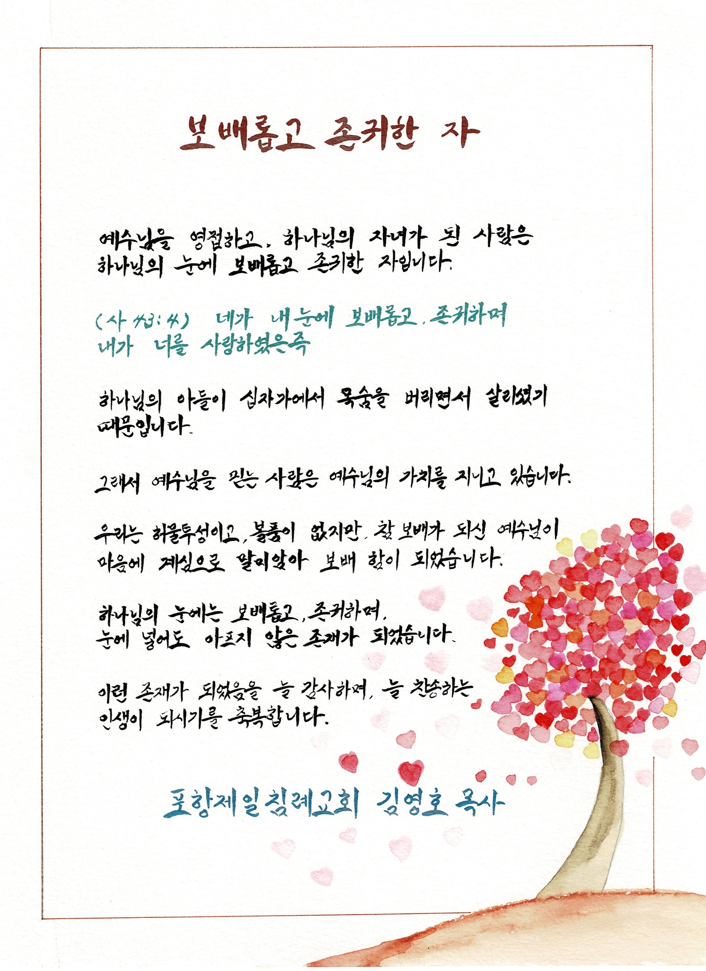 4. 네가 내 눈에 보배롭고 존귀하며 내가 너를 사랑하였은즉 내가 네 대신 사람들을 내어 주며 백성들이 네 생명을 대신하리니